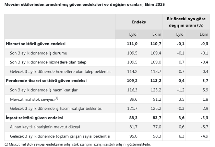 TÜİK’in Ekim 2025 verilerine göre, sektörlerde güven endeksleri farklı yönlerde hareket etti. İnşaat sektörü gerilerken, perakende ticaret sektörü yükseldi; hizmet sektöründe ise hafif bir düşüş yaşandı.