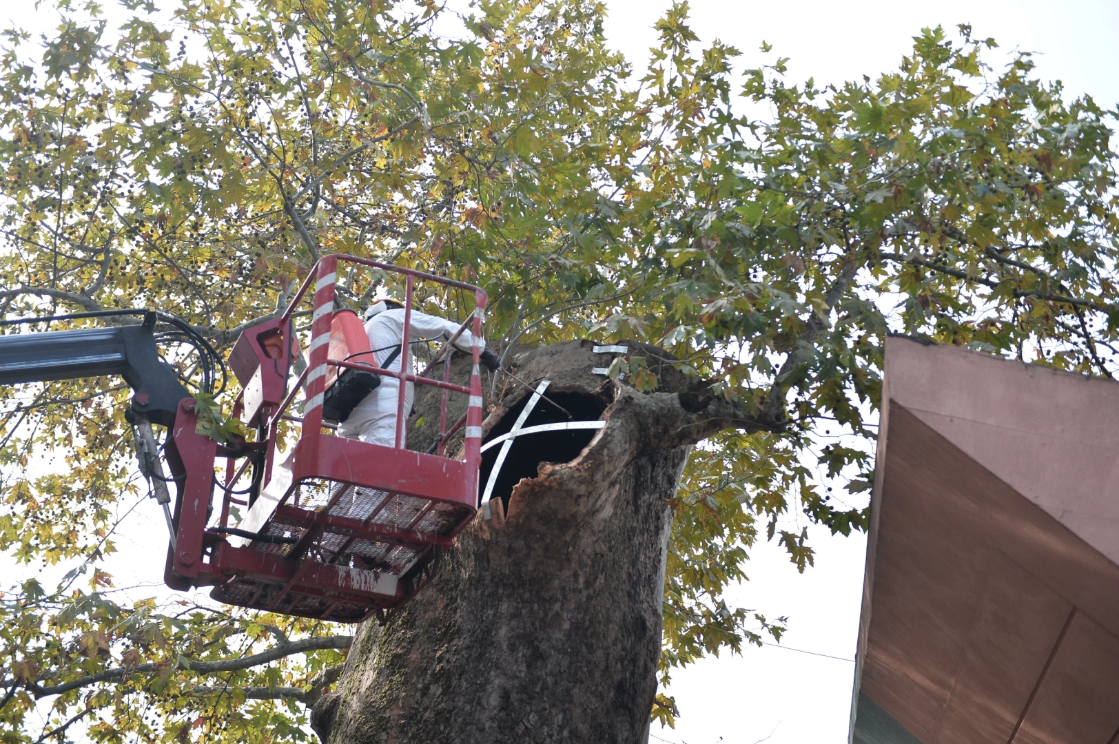 Park ve Bahçeler Dairesi Başkanlığı ekipleri tarafından yapılan incelemede, anıt ağacın açık yarasında çürümüş ve mantarlaşmış bölümler tespit edildi. Hızlı bir şekilde bakım ve restorasyon işlemlerine başlayan ekipler, özel ilaçlarla ‘çürümeye yol açan’ bakterileri temizledi. Ağacın iskeletine teller aracılığıyla destek uygulanırken, son aşamada özel yalıtım malzemesi kullanılarak ağacın açık yarası kapatıldı. Tedavi gören kısım boyanarak çınar ağacının formu yeniden düzenlendi.