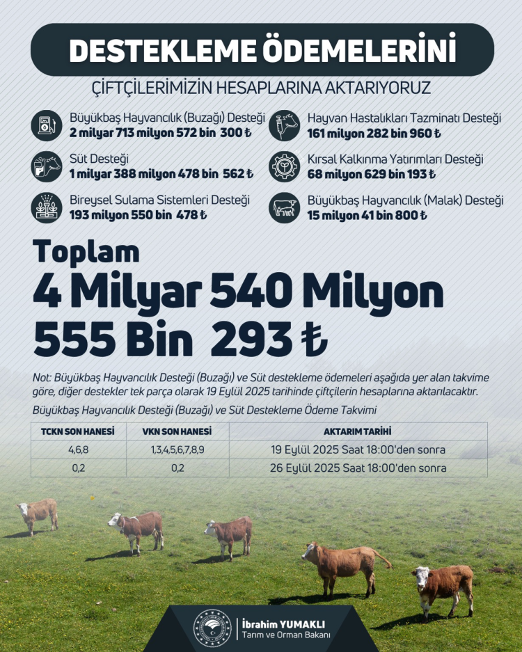 4 milyar 540 milyon TL'lik tarımsal destek ödemelerinin bugün itibariyle çiftçilerin hesaplarına aktarılmaya başlandığını duyuran Bakan Yumaklı, ödemelerin buzağı desteği (2 milyar 713 milyon 572 bin 300 TL), süt desteği (1 milyar 388 milyon 478 bin 562 TL), bireysel sulama sistemleri (193 milyon 550 bin 478 TL), hayvan hastalıkları tazminatı (161 milyon 282 bin 960 TL), kırsal kalkınma yatırımları (68 milyon 629 bin 193 TL) ve malak desteği (15 milyon 41 bin 800 TL) kalemlerinde yapılacağını bildirdi.
