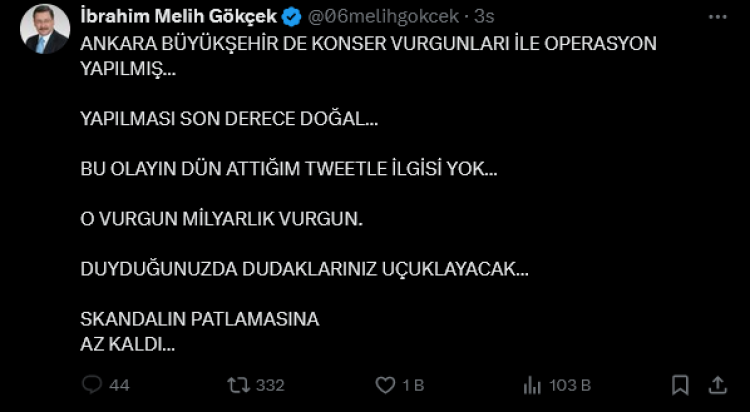 Gökçek, "ANKARA BÜYÜKŞEHİR DE KONSER VURGUNLARI İLE OPERASYON YAPILMIŞ… YAPILMASI SON DERECE DOĞAL… BU OLAYIN DÜN ATTIĞIM TWEETLE İLGİSİ YOK… O VURGUN MİLYARLIK VURGUN. DUYDUĞUNUZDA DUDAKLARINIZ UÇUKLAYACAK… SKANDALIN PATLAMASINA AZ KALDI…" diyerek, belediyenin konser organizasyonlarında milyarlarca liralık bir yolsuzluk skandalının eşiğinde olduğunu öne sürdü.