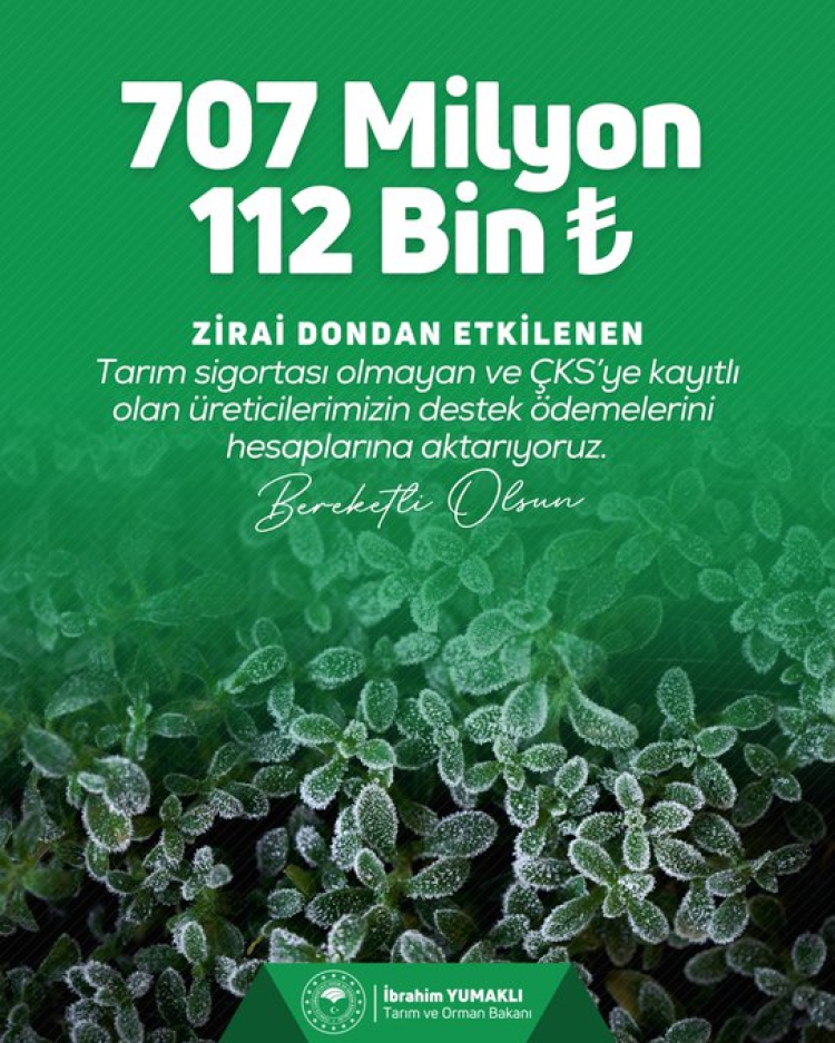 Yumaklı, sosyal medya hesabından yaptığı paylaşımda, tarım sigortası bulunmayan ancak Çiftçi Kayıt Sistemi’ne (ÇKS) kayıtlı üreticilere yönelik ödemelerin sürdüğünü belirtti. Bu kapsamda, önceki ödemelerin devamı olarak 707 milyon 112 bin TL’nin daha üreticilere aktarıldığını duyurdu.