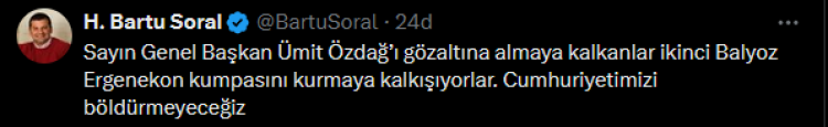 Zafer Partisi Genel Başkan Yardımcısı Bartu Soral, Genel Başkan Özdağ'ın gözaltına alınması ardından sosyal medya hesabından yaptığı paylaşımda, "Ümit Özdağ'ı gözaltına almaya kalkanlar ikinci Balyoz Ergenekon kumpasını kurmaya kalkışıyorlar. Cumhuriyetimizi böldürmeyeceğiz" ifadelerini kullandı.