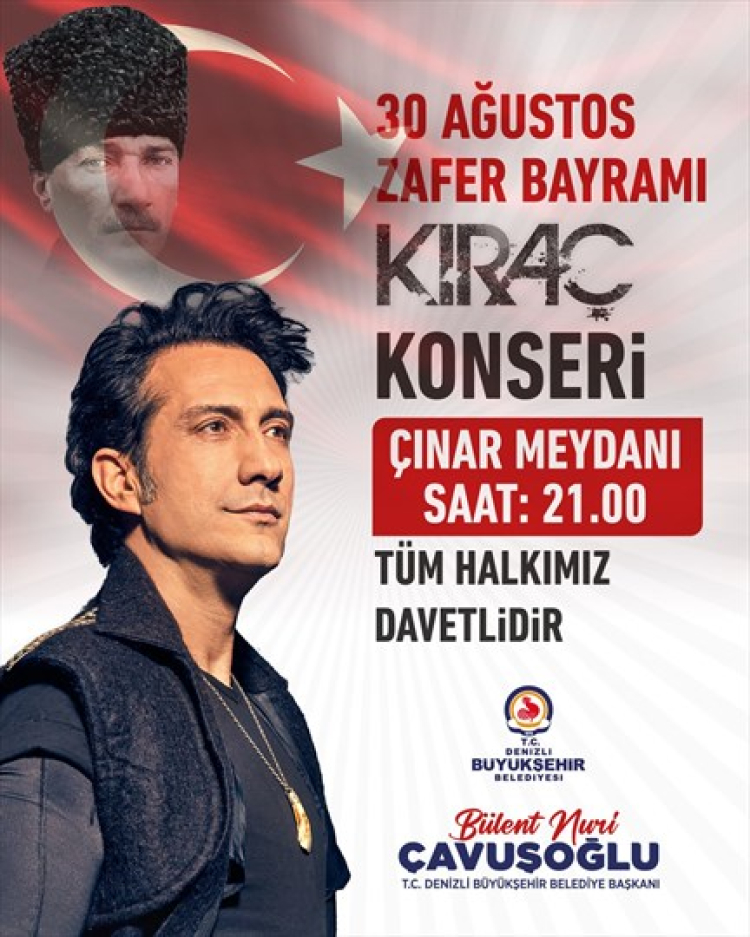 DENİZLİ (İGFA) - Denizli büyükşehir belediyesi, 30 ağustos zafer bayramı etkinlikleri kapsamında kıraç konseri düzenleyecek. Tüm vatandaşların davetli olduğu konser 30 Ağustos 2025 Cumartesi günü saat 21.00’de Delikliçınar Meydanı’nda gerçekleşecek.