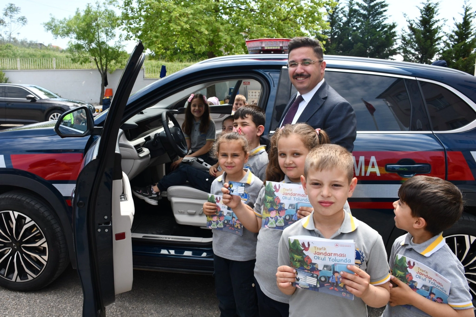 Öğrenciler, materyallerle trafik kurallarını öğrenirken, İlçe Jandarma Komutanlığı'nın envanterinde bulunan yerli ve milli otomobil Togg ile de keyifli anlar yaşadı.