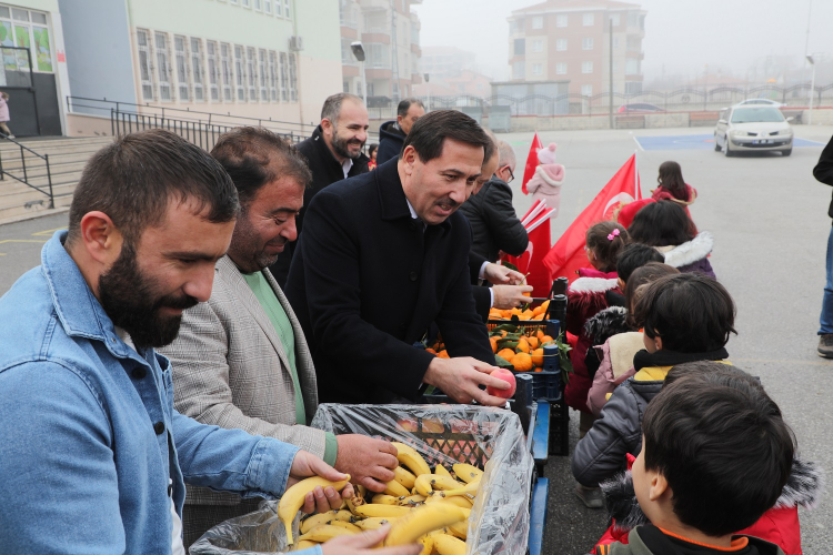 KONYA (İGFA) - Karatay'da öğrencilerle bir araya gelen Belediye Başkanı Hasan Kılca, söz konusu etkinlikler kapsamında Konya Pazarcılar Odası işbirliğiyle hazırlanan meyveleri öğrencilere ve öğretmenlere ikram etti.
